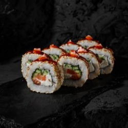 Состав: Рис, Творожный сыр, лосось, огурец, нори, кунжут, унаги соус, соус лава(майонез и икра масаго) 8 шт. 270 гр .