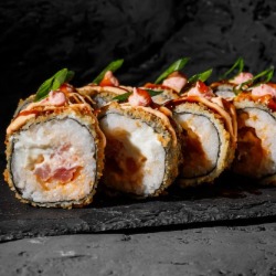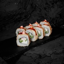 Состав: рис, лосось, творожный сыр, огурец, икра масаго, нори, сухари панко, унаги-соус 8 шт. 270 гр .