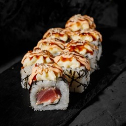 Состав: рис, тунец, соус спайси, майонез, соус монако, моцарела, шрирача, кунжут, нори, соус унаги, творожный сыр 8 шт. 270 гр .